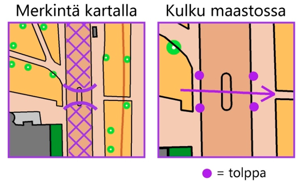 D. Vägningsmarkeringar. Att runda en kon eller stolpe på fel sida vid en vägövergång utan att återvända leder till diskvalificering (2). Bilderna nedan visar hur det ser ut på kartan och i terrängen.