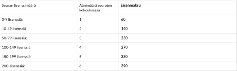 - Föreningsavgifterna kommer fr.o.m. 1.1.2026 basera sig antalet licensorienterare i en förening, indelat i kategorier som igen baserar sig på antalet röster en förening har på föreningarnas möte (se bild nedan).