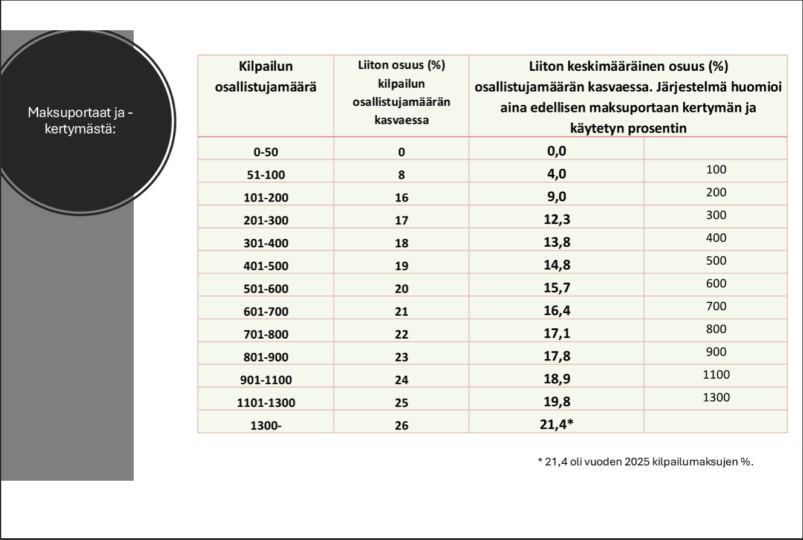 Det nya systemet tas i bruk fr.o.m. 1.1.2026. För att ta i bruk automatisering bör varje förening som arrangerar tävlingar i Irma göra ett Paytrail avtal. SSL kommer att informera föreningar noggrannare om detta. På bilden nedan syns de nya principerna för förbundets andel av deltagaravgifter.